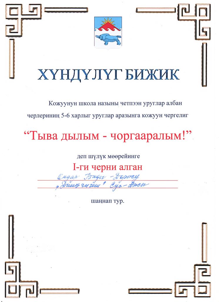 Тыва дыл хунунге тураскааткан Сут-Хол кожууннун школа назыны четпээн, 5-6 харлыг чаштарынын аразынга «Тыва дылым-чоргааралым!» деп шулук моорейи болуп эрткен. Бистин садигивистен Ондар Бады-Доржу биле Сарыглар Ай-Хээна барып киришкеннер. Конкурска шупту 19 бичии чаштар киришкеннер. Моорейнин туннелинде бистин чаптанчыг оглувус Ондар Бады-Доржу 1-ги черни толептии-биле алган. Сарыглар Ай-Хээна «Аянныг шулук нормчукчузу» деп атка толептиг болган. Эр-хейлер!